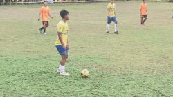 Striker Bhayangkara Jurnalis FC, David (Kuning), Melakukan Gerakan Akrobatik untuk Membobol Gawang Pasir Putih Tumpapa .- Foto : EquatorNews