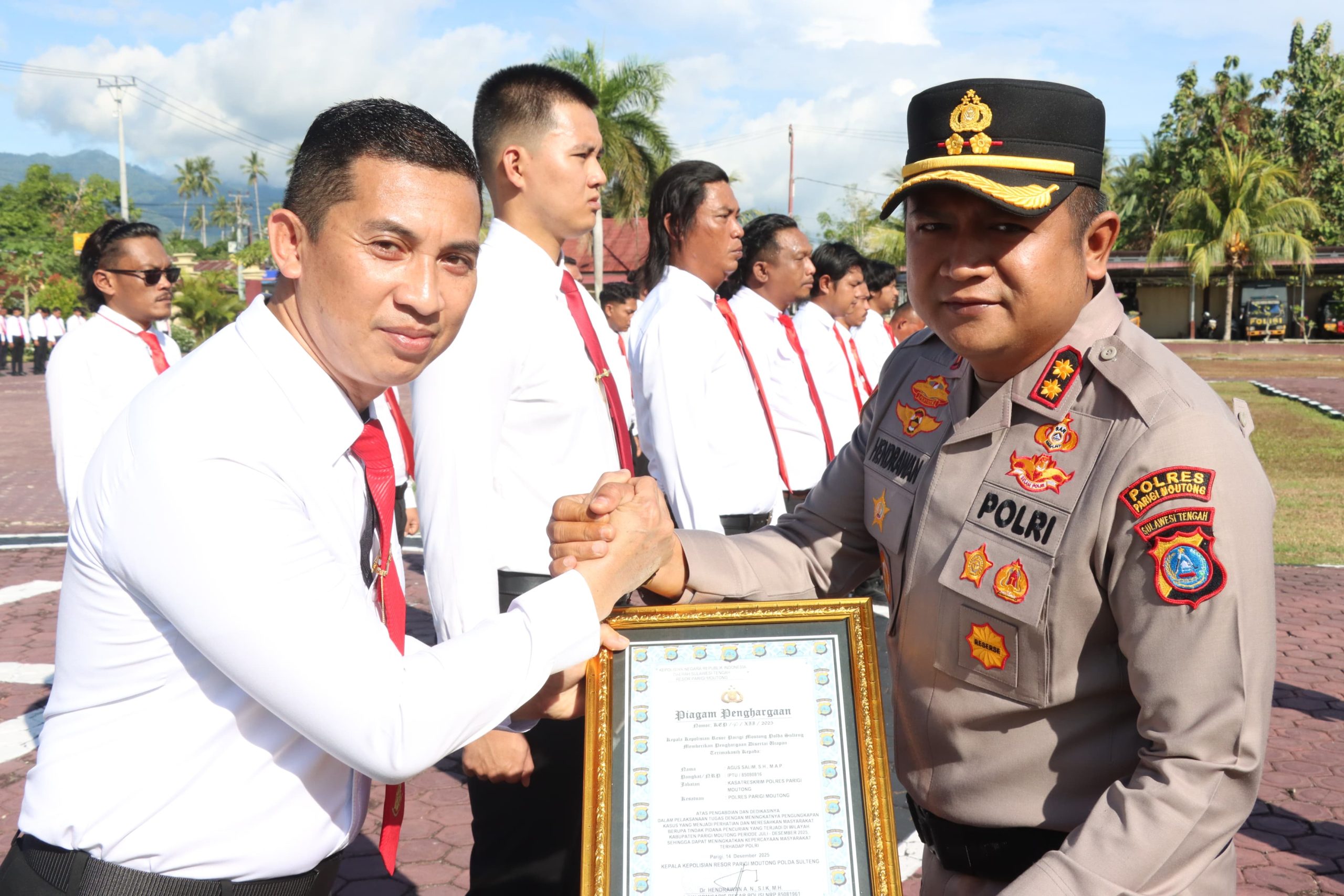 PARIGI, EQUATORNEWS — Pagi itu, halaman Mapolres Parigi Moutong menjadi saksi bahwa kerja senyap dan pengabdian tanpa pamrih tak pernah benar-benar luput dari perhatian. Dalam suasana apel Jam Pimpinan yang khidmat, Senin 15 Desember 2025, Kapolres Parigi Moutong AKBP Dr Hendrawan Agustian Nugraha S.IK MH, menyerahkan piagam penghargaan kepada personel terbaik dari Satuan Reserse Kriminal dan Satuan Reserse Narkoba.