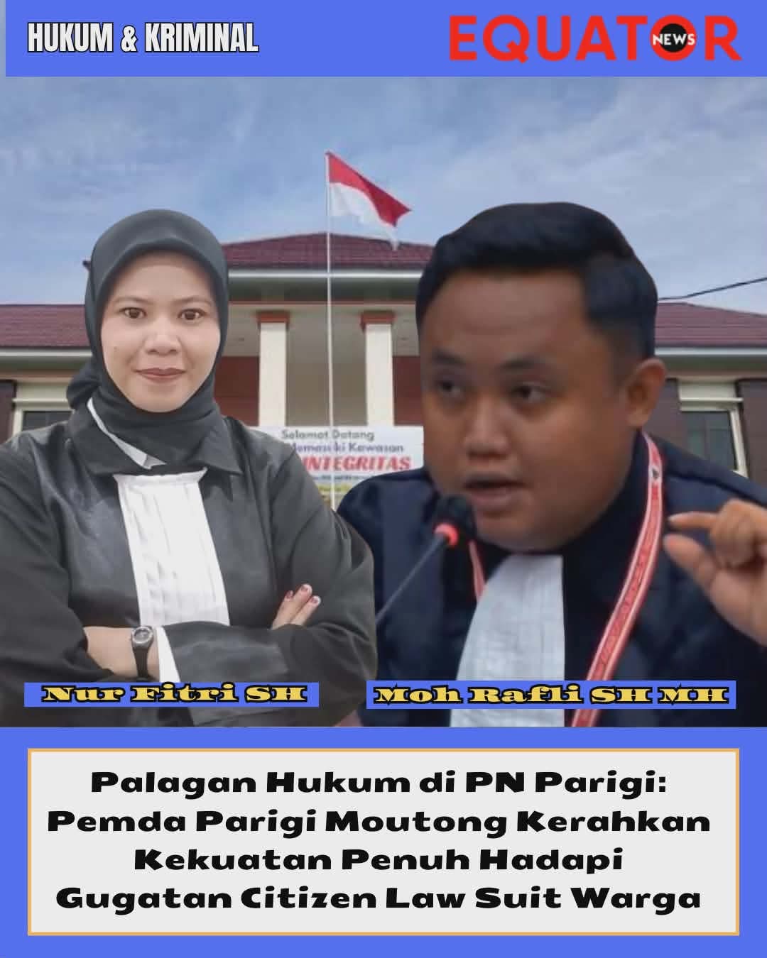 PARIGI, EQUATORNEWS – Sebuah drama hukum yang sarat akan duka dan tuntutan keadilan kini sedang bersiap naik pentas di balik jeruji wibawa Pengadilan Negeri Parigi. Di bumi yang masih dirundung nelangsa , Pemerintah Daerah Kabupaten Parigi Moutong secara resmi menyatakan kesiapan penuh untuk berhadapan dengan warganganya sendiri dalam palagan konstitusi yang dikenal sebagai Citizen Law Suit.