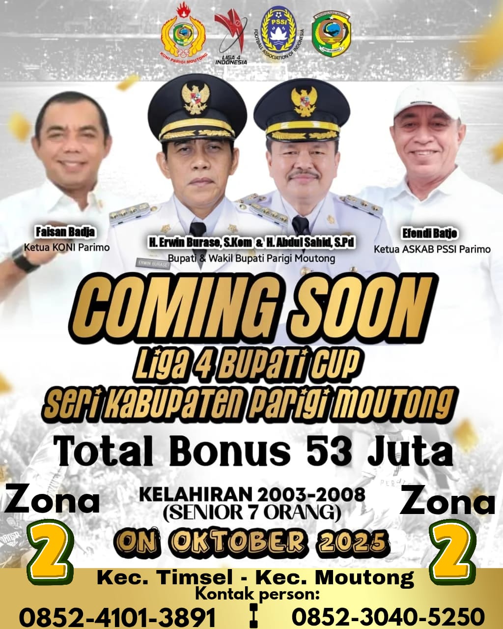 PARIGI, EQUATORNEWS – Kompetisi sepak bola paling bergengsi tingkat kabupaten, Liga 4 PSSI Seri Parigi Moutong (Bupati Cup 2025), segera digelar dalam waktu dekat. Hingga saat ini, puluhan klub dari dua zona telah resmi mendaftarkan diri untuk ambil bagian dalam ajang tersebut.